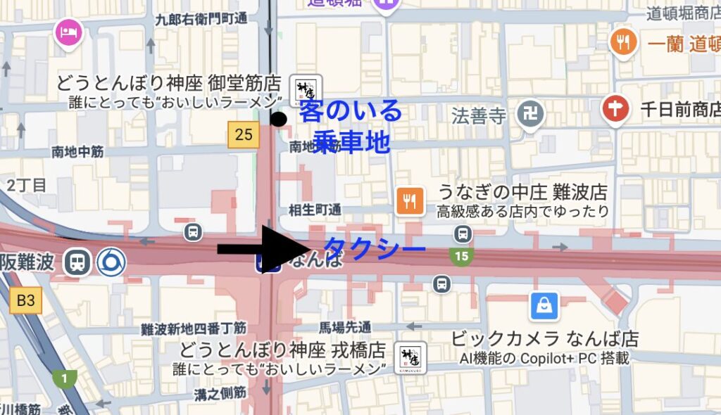 千日前通りを東向きに走っていて難波の交差点を通ったタイミングでGOアプリが鳴って客のいる乗車ちはなんと道頓堀の神座の近辺やった!